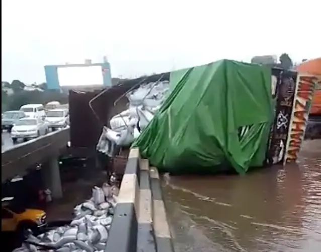 The driver compartment was found hanging down the bridge with some of the product (wheat) all over the road blocking the entire route under the bridge inward Otedola estate.