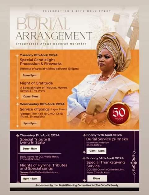 The final journey of late PROPHETESS DEBORAH GBOLASERE OSHOFFA (1973-2024) would begin on Tuesday, 9th April, 2024, with a Candlelight Procession, Fireworks and Tributes and climax on Sunday, 14th April, 2024, with a Thanksgiving Service at the Celestial Church of Christ, Saint S.B.J. Oshoffa Cathedral, International Headquarters, Ketu, Lagos.