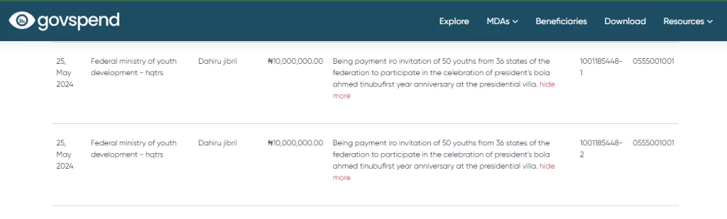 Ibrahim’s ministry made N10 million payments twice to one Dahiru Jibril on May 25, 2024, for the same purpose. Each payment, FIJ found on the Govspend portal, has a different payment number.