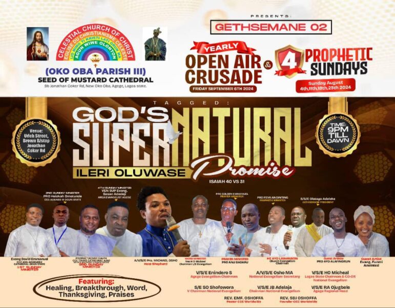 In the awe of Christ and modesty of religious believers, the Celestial Church of Christ, Seed of Mustard Cathedral (Oko-Oba Parish III) has announced a world presence Four Prophetic Sunday,  Supernatural gatherings to request and attain undiluted promises from God.