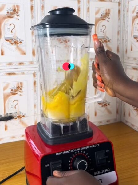 Revealing in the video, the chef added eggs, baking powder, and Ponmo into a blender to achieve a smooth mix.
