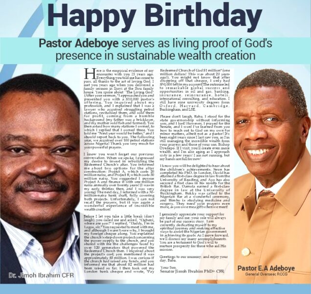 In a congratulatory birthday advertisement published on the front page of The Nation, marking Pastor Adeboye’s 83rd birthday, the former publisher of defunct National Mirror, Ibrahim, a member of the All Progressives Congress (APC) who previously lost the governorship primary election to Governor Lucky Aiyedatiwa, expressed that his financial contributions to the esteemed church have significantly enhanced his professional prospects. Continue Reading.