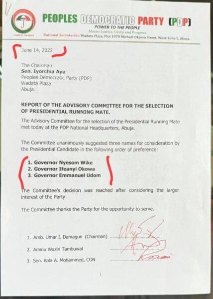 A newly surfaced document, titled “Report of the Advisory Committee for the Selection of Presidential Running Mate,” has contradicted former Vice President Atiku Abubakar’s claim regarding his choice of running mate for the 2023 presidential election.