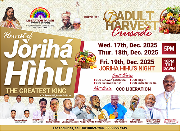 The Celestial Church of Christ (CCC), Liberation Parish (Dwelling of Peace), is set to host its 7th Harvest of Jòrihá Hìhù (The Greatest King) from December 17 to 21, 2025.