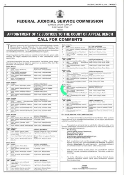 His name appeared in a notice issued by the Federal Judicial Service Commission (FJSC) titled “APPOINTMENT OF 12 JUSTICES TO THE COURT OF APPEAL BENCH – CALL FOR COMMENTS.”