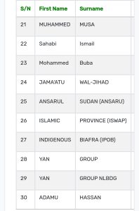 Among those listed are individuals reportedly associated with groups such as the Indigenous People of Biafra (IPOB), Ansaru, and the Islamic State West Africa Province (ISWAP).