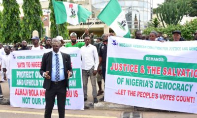 Members of the Nigerian-American Coalition for Justice and Democracy were seen on Wednesday, staging a solidarity march outside the tribunal venue in Abuja. The coalition members...